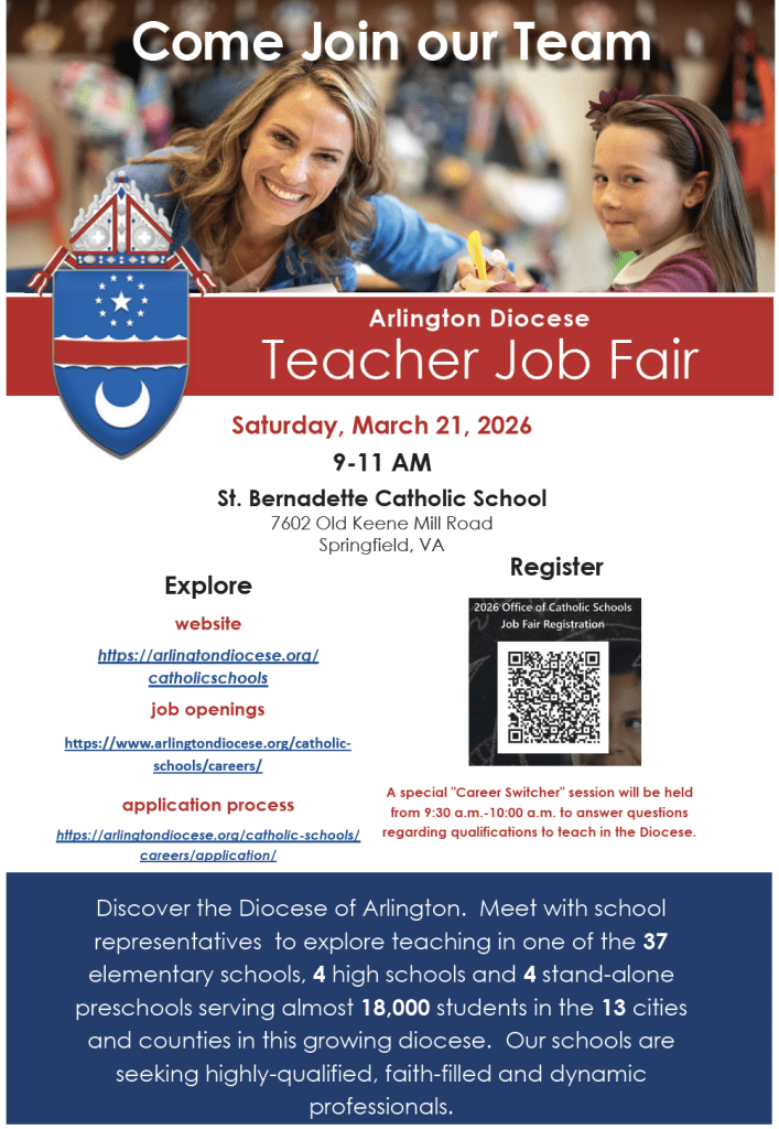 Arlington Diocese Teacher Job Fair – March 21 Posted on February 17, 2026February 17, 2026 by Cecilia Mondarez Come see all Saints Catholic School and so many other wonderful schools from throughout the Arlington Diocese!
